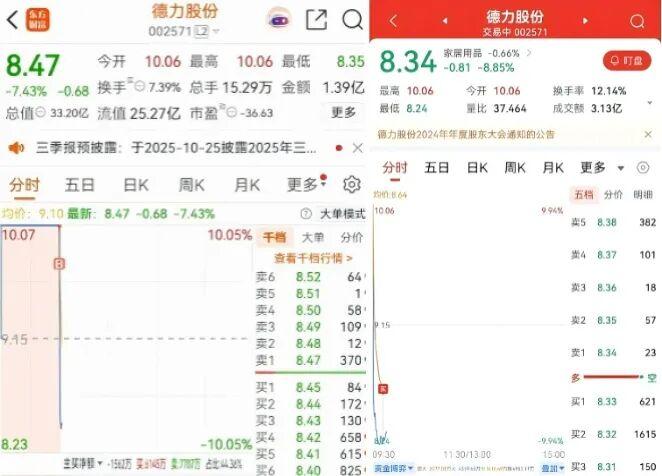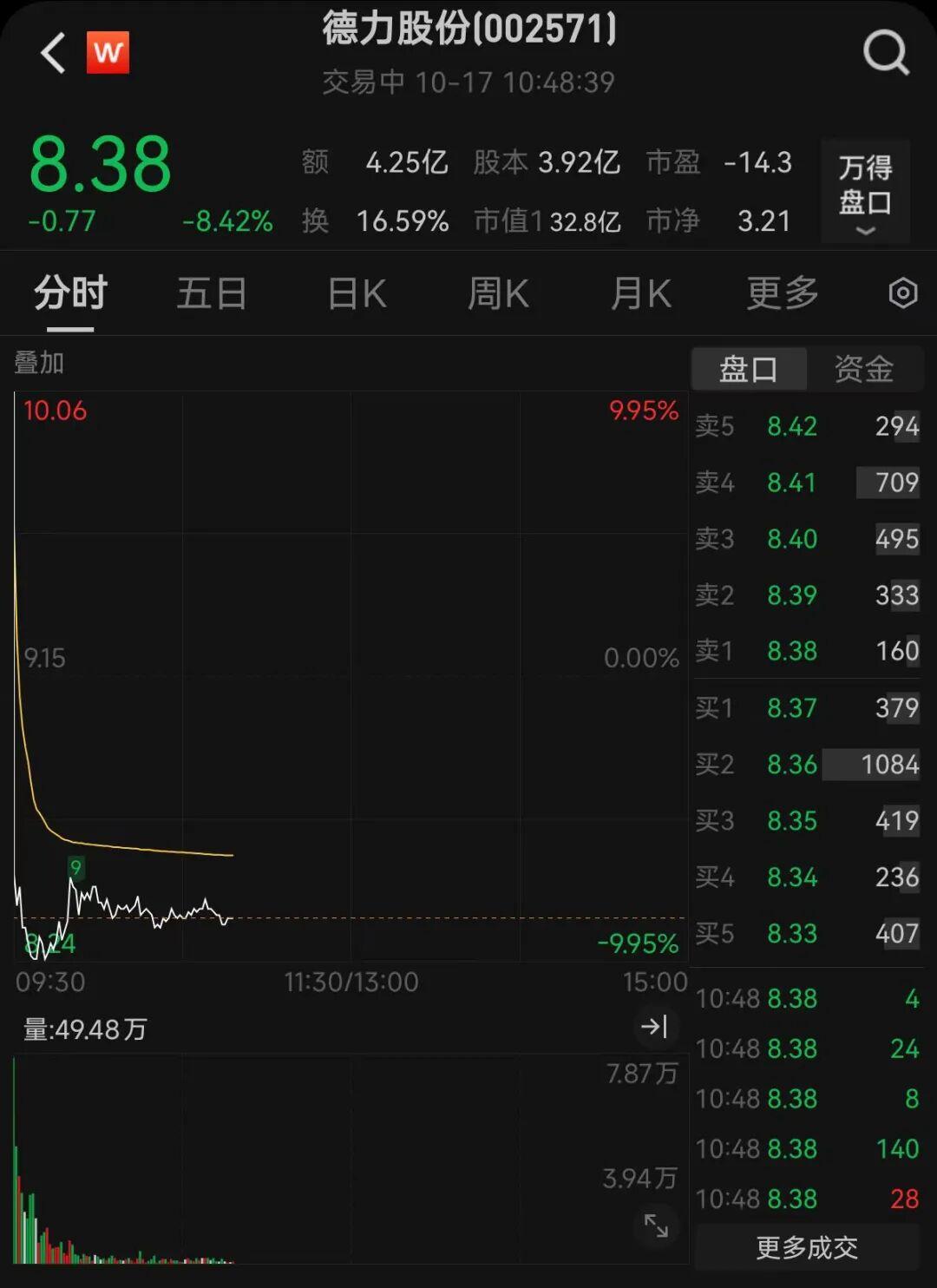 17日早盘,德力股份以离涨停价仅差1分钱的10.06元/股开盘,但随即调头向下,盘中一度触及跌停,上演“准天地板”。截至发稿时,该股报8.38元/股,跌幅8.42%,换手率16.59%。