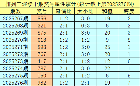 上期回顾:排列三第2025276期奖号:982。类型:组六,奇偶形态:奇偶偶,大小形态:大大小,和值:19,跨度:7。